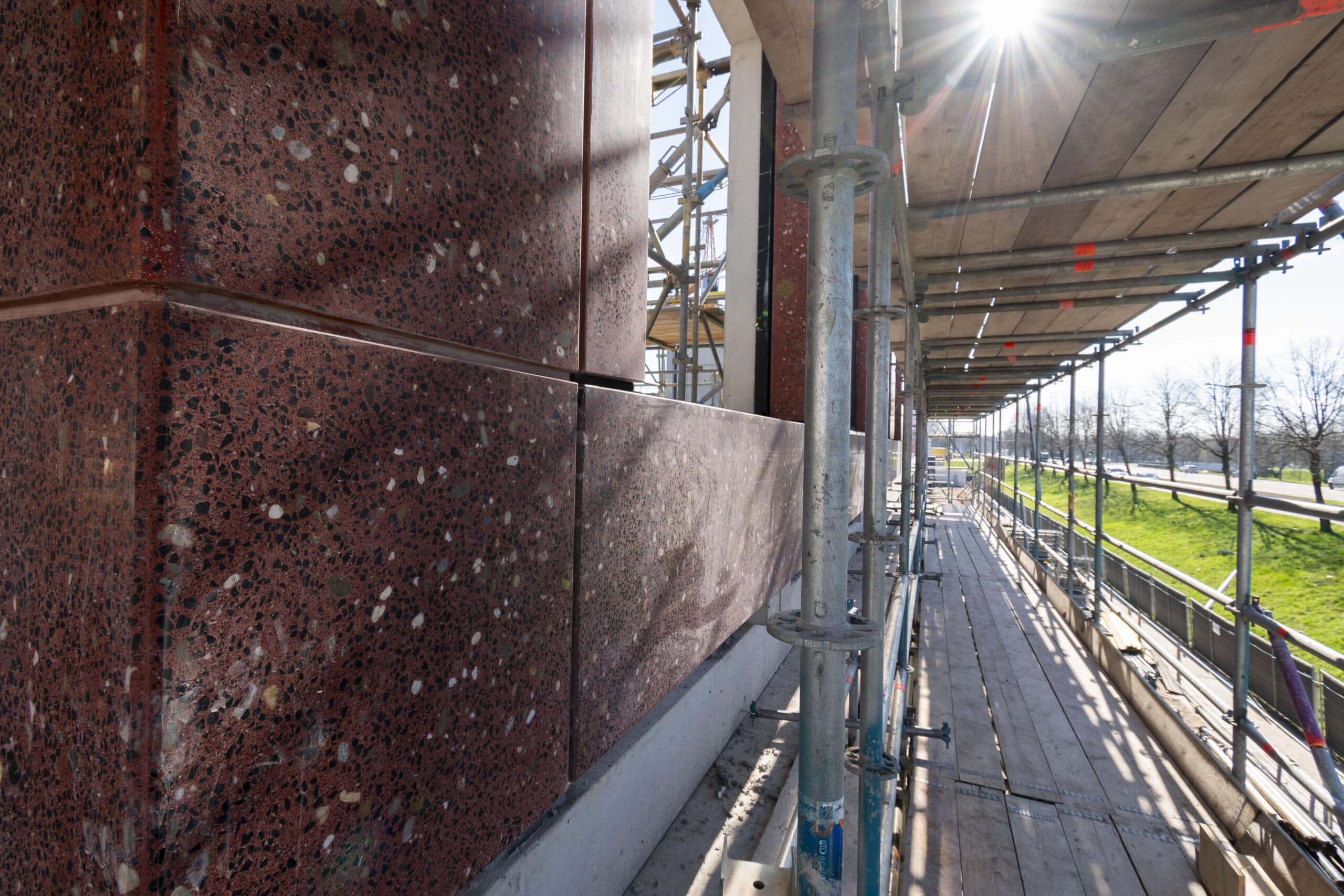 Bij de kantoortoren zijn inmiddels de kanaalplaatvloeren van de tweede verdieping gelegd. De eerste galerijplaten, vervaardigd uit wit gepolijst beton, worden begin april aangebracht. De kantoorgevel bestaat van vloer tot plafond uit glazen vliesgevels met schuifpuien. De strakke gevel wordt onderbroken door rood gepolijste penanten die tussen de witte galerijplaten worden geplaatst.