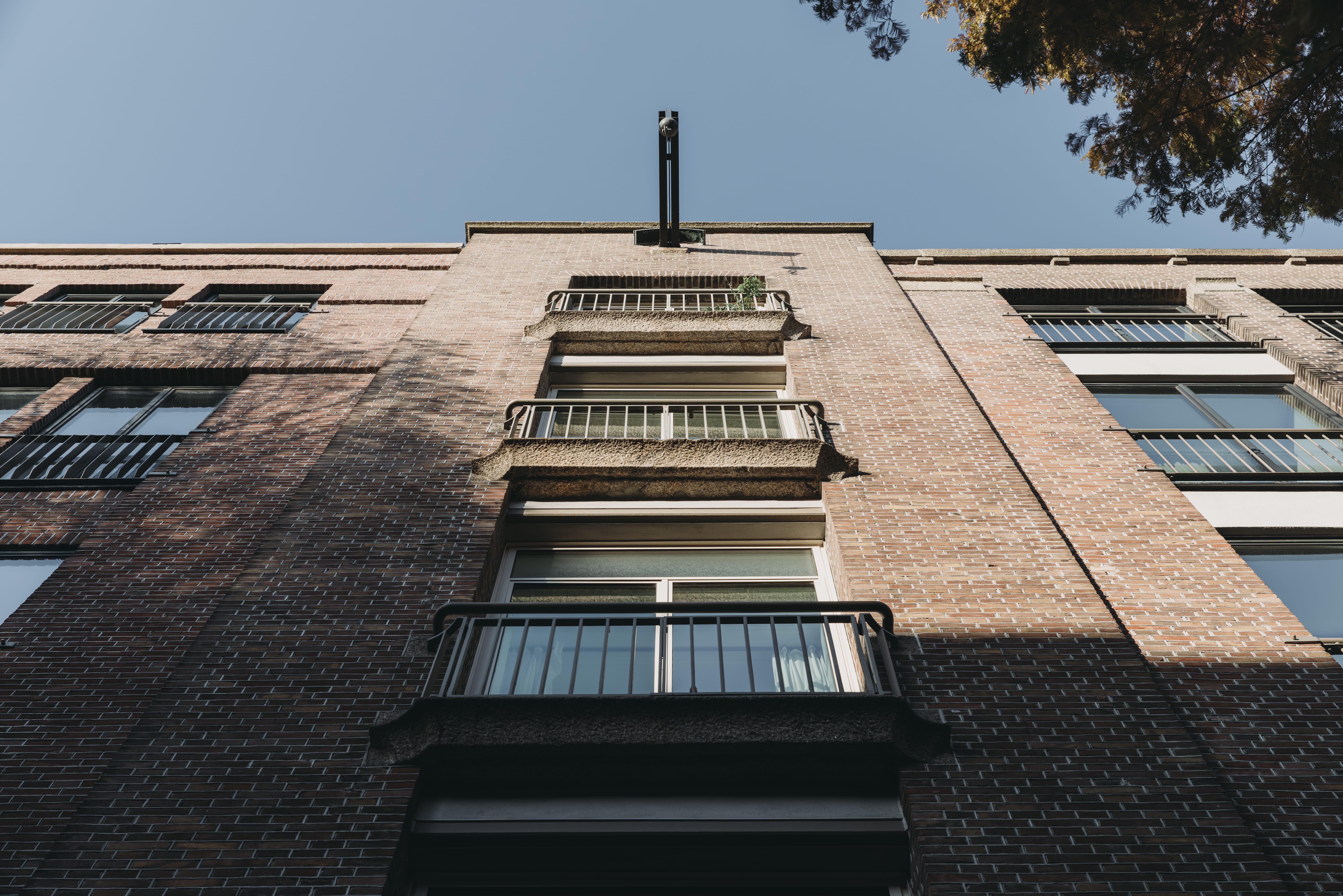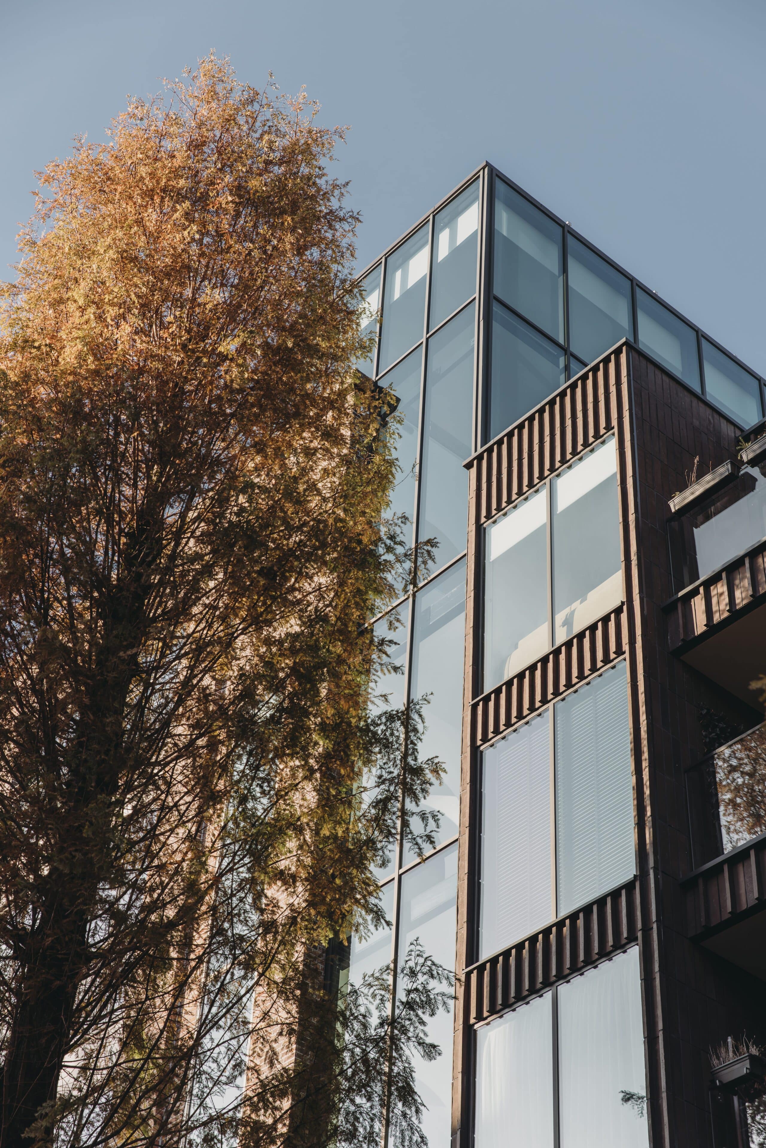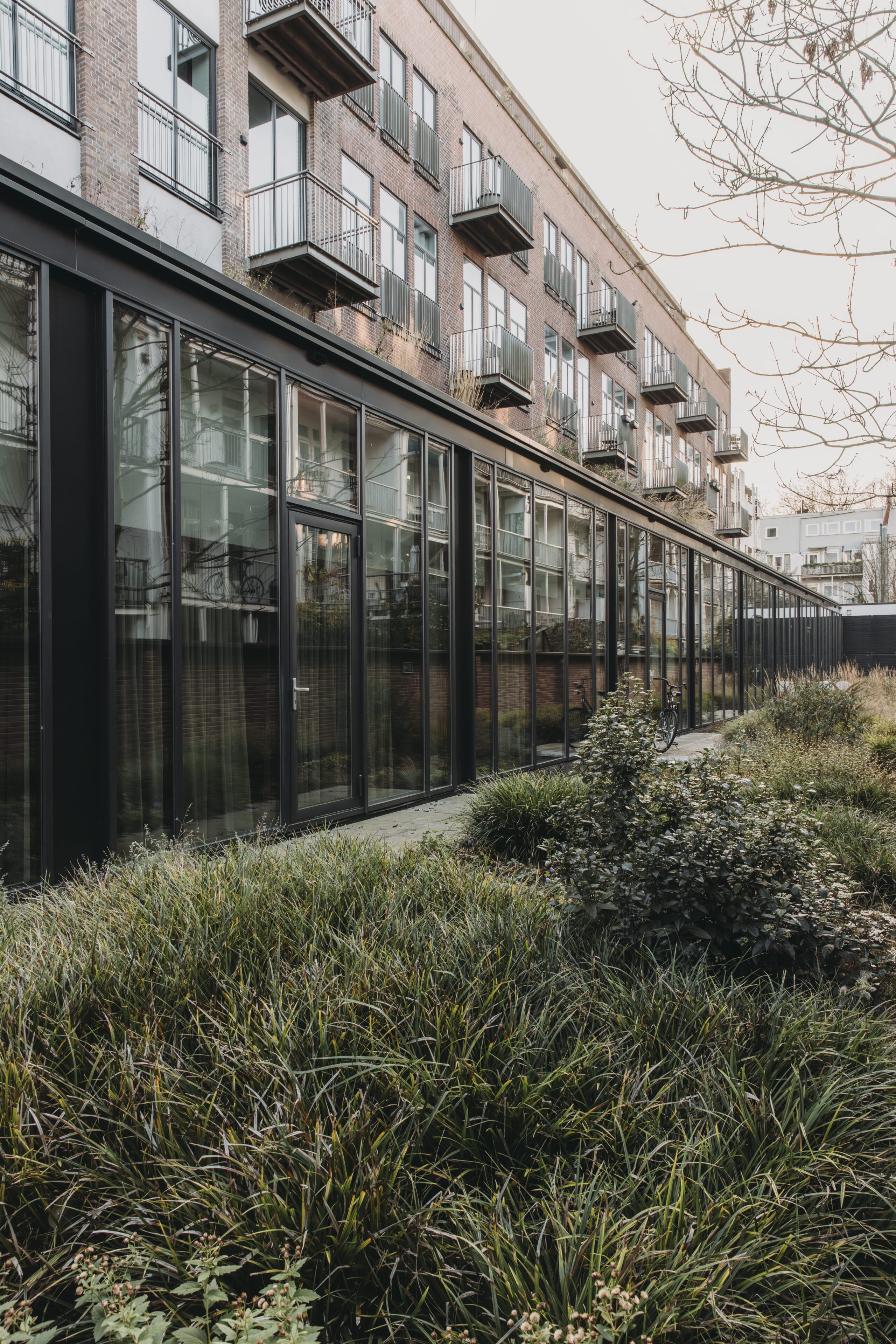We gaven de gevel een complete opknapbeurt. Het metselwerk is hersteld, de lichte kunststof kozijnen zijn vervangen voor donker aluminium met HR++ glas. De ramen aan de voorgevel zijn doorgetrokken tot net boven de vloer om zo Franse balkons te creëren. Het glas-in-lood aan de linkerzijde is hersteld en geïsoleerd. Op de begane grond zijn de gevelopeningen samengevoegd; zo krijgt het pand een open karakter.