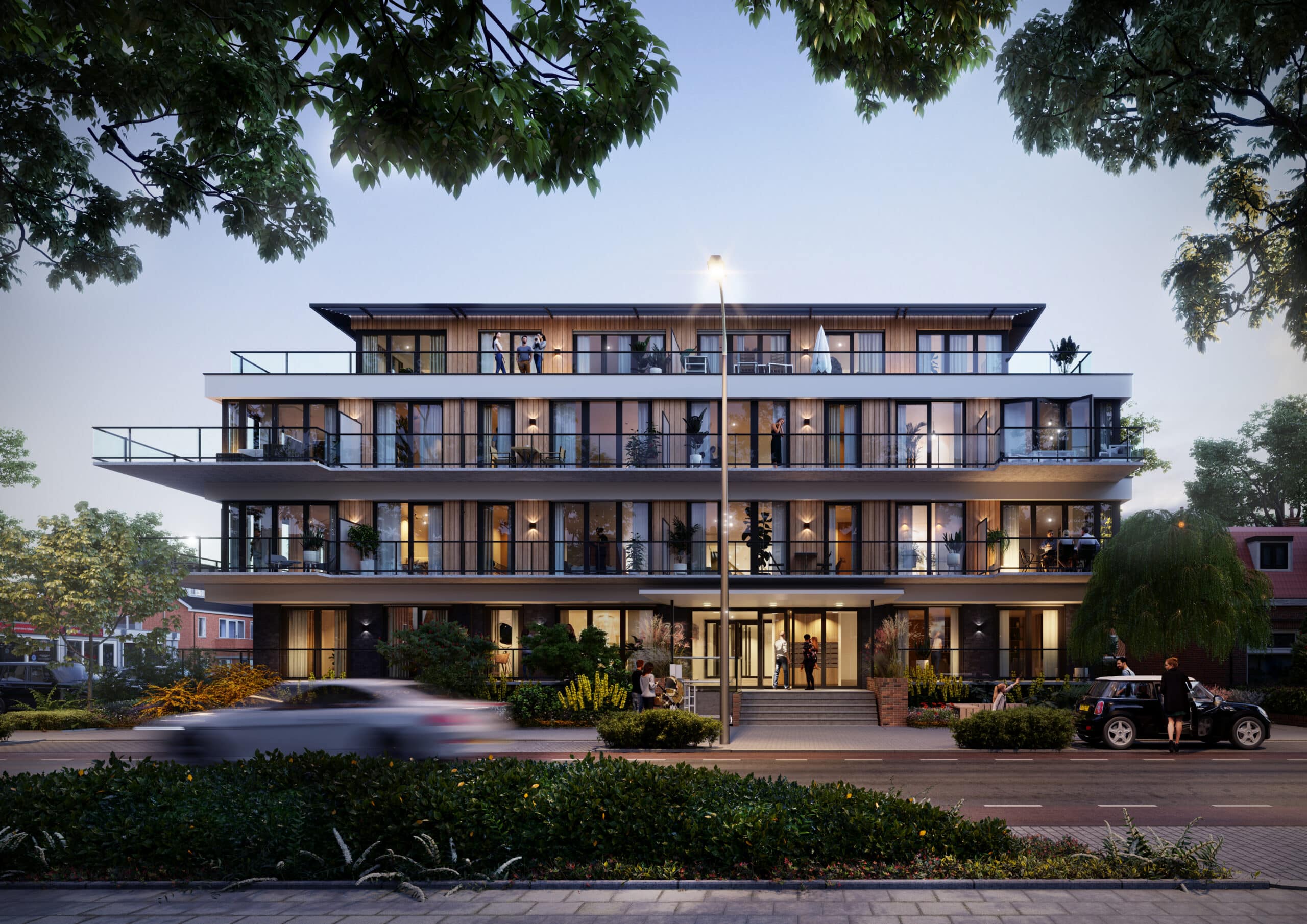 De gevel maakt het verschil. In de plint zit antraciet leisteen, op de verdiepingen grenenhouten gevelbekleding. De balkons zijn van beton, de ramen omlijst door zwarte aluminium kozijnen. De balustrades zijn van glas met stalen leuningen – dat zorgt voor transparantie. Horizontale grijze banden van een halve meter benadrukken de verschillende bouwlagen. De combinatie van licht-donker en ruw-glad geeft het gebouw een eigentijdse uitstraling. Een verrassende aanwinst voor de buurt.