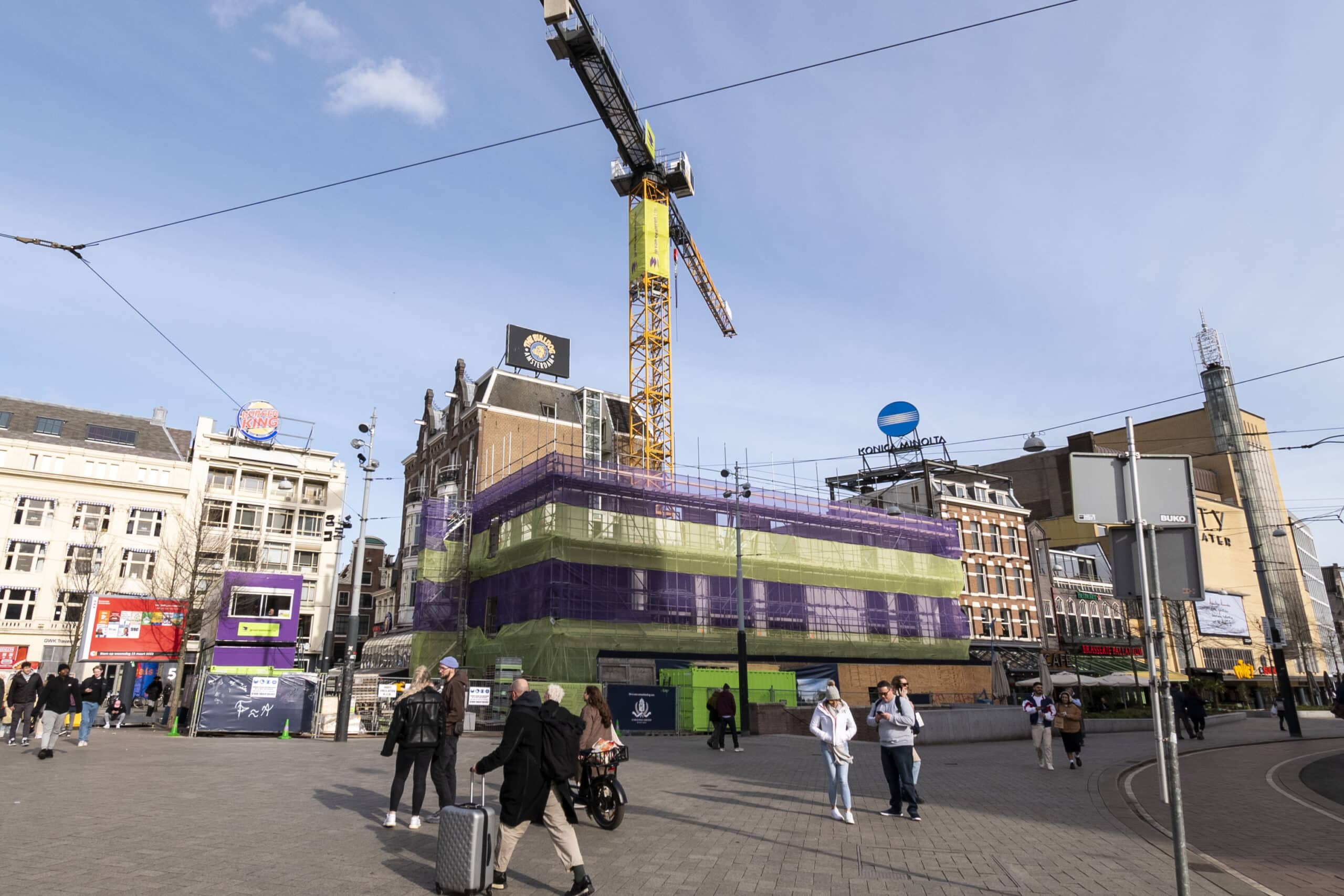 Recentelijk is het eerste gedeelte van de steiger neergezet, de komende weken zal deze met de verdiepingen mee verder omhoog worden getrokken. Achter deze steiger wordt gewerkt aan het nieuwe gezicht van de Heineken Hoek. Het opbouwen van de constructie van de betonnen gevel is in volle gang, de isolatie wordt aangebracht en de stelkozijnen geplaatst. Octatube, specialist in bijzondere gevels, is gestart met het bouwen van de constructie waaraan de nieuwe, glazen gevel wordt opgehangen.